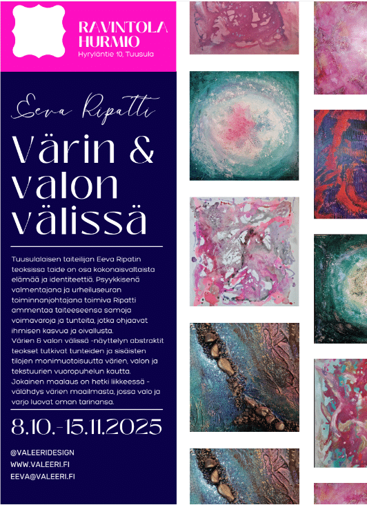 Näyttelyn Värien & valon välissä abstraktit teokset liikkuvat tunteiden, valon ja värien rajapinnoilla. Maalaukset kutsuvat pysähtymään siihen hetkeen, jossa värit hengittävät ja valo paljastaa uusia ulottuvuuksia.